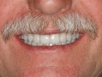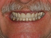 Patient had gum disease due to poorly fitting crowns and bite issues. Bite corrected, laser periodontal treatment and new porcelain crowns to restore bite and health. Additionally, patient no longer snores as the corrected bite allowed for opening the airway.