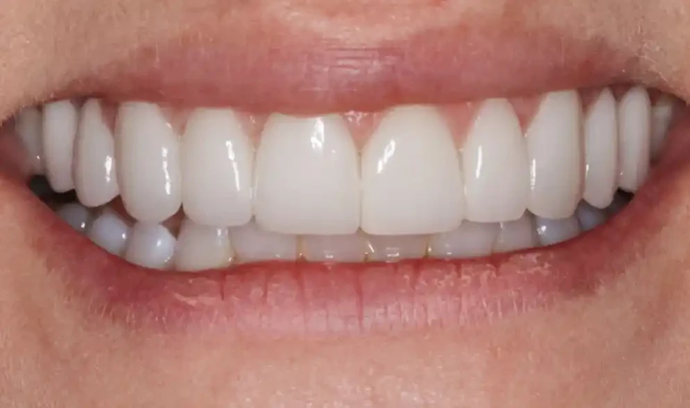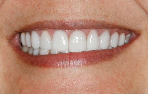 New porcelain veneers exhibiting correct tooth proportions and vitality with a natural tooth-colored shade.