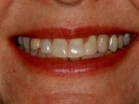 This patient was suffering from TMJ pain and was treated first with a fixed orthotic and then with porcelain veneers and onlays. She is now pain-free and has a nice smile and improved facial symmetry and profile.