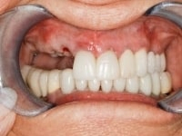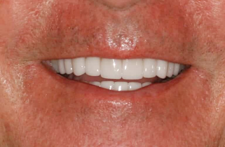 Deep overbite corrected with physiologic dentistry and porcelain restorations. By correcting the bite using physiology, the resulting facelift followed. Also, note how all his teeth were saved and built up to the correct facial and bite positions.