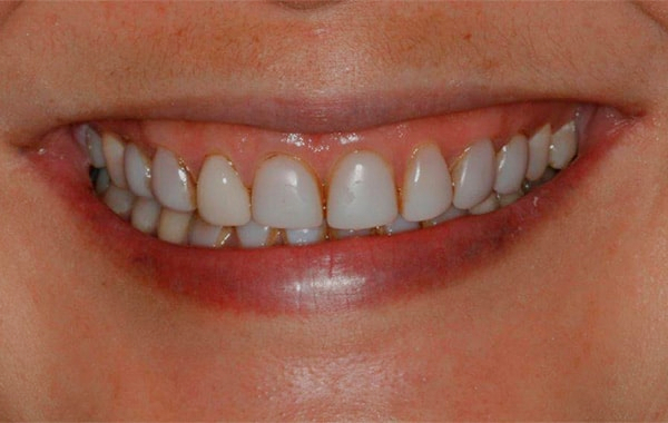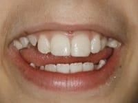 Discolored and protruded front teeth, the patient desired natural appearing teeth that blend in with her lower teeth. Note the advanced porcelain veneer smile design that also corrected the protruding front teeth to create a beautiful profile and smile.