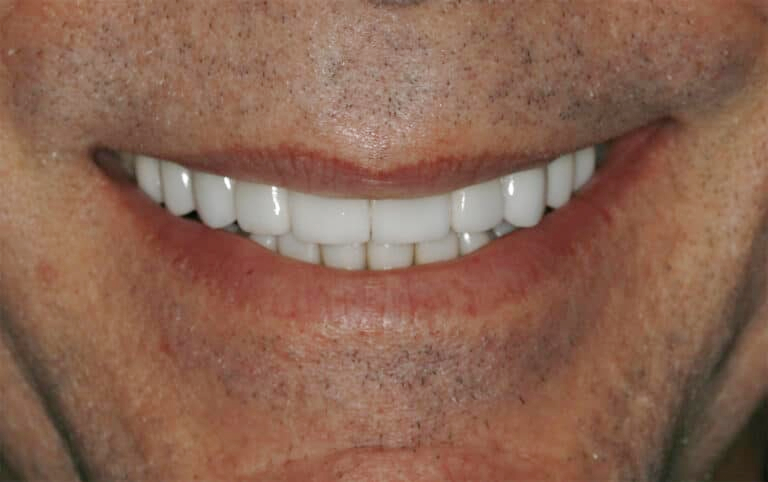 This patient was breaking his teeth due to his bite and had severely worn teeth and a collapsed bite from TMJ dysfunction. Notice the improvement of the lower third of the face and the youthfulness in his new smile and improved bite.