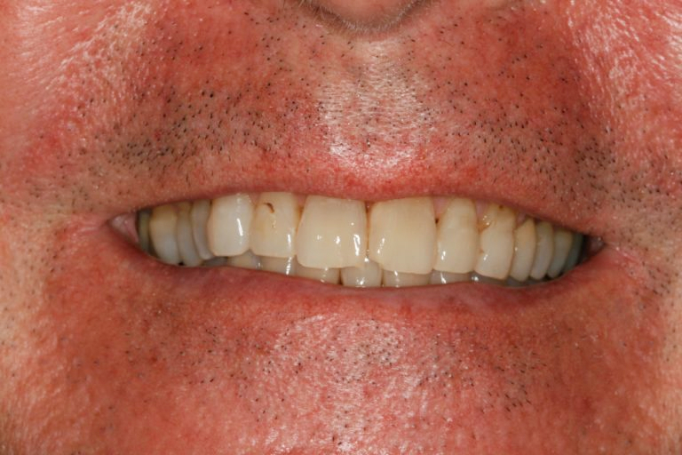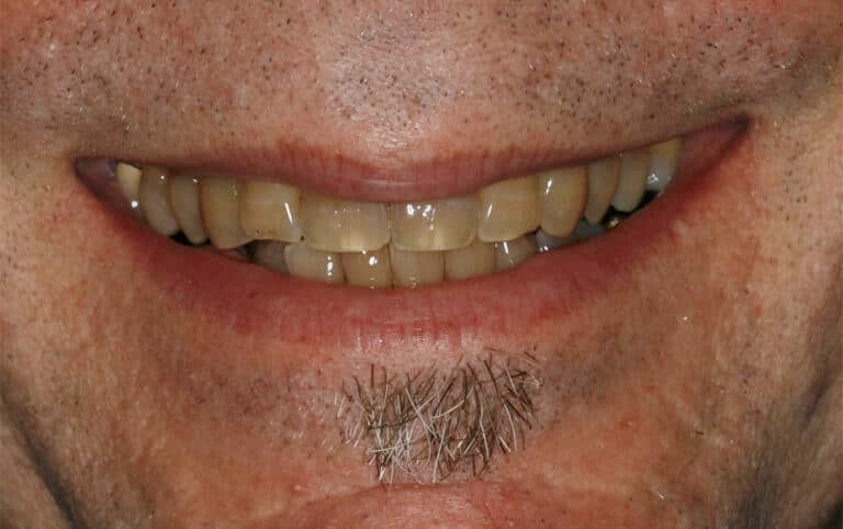 This gentleman was unhappy with his smile in addition to being told the lower four front teeth and upper lateral incisors were loose. Dr. Konig noted his bite, or the way the teeth meet together was damaging these teeth. His bite was over-closed, causing excess trauma on the front teeth which also caused the gum recession. By correcting his bite and TMJ issues, we were able to save all these teeth and create an attractive and confident smile. This involved correcting the bite on the back teeth, re-aligning his jaw and cosmetic porcelain veneers on the front teeth. This also increased the lower 1/3 of his face (nonsurgical dental facelift) which in turn created a more youthful facial profile.
